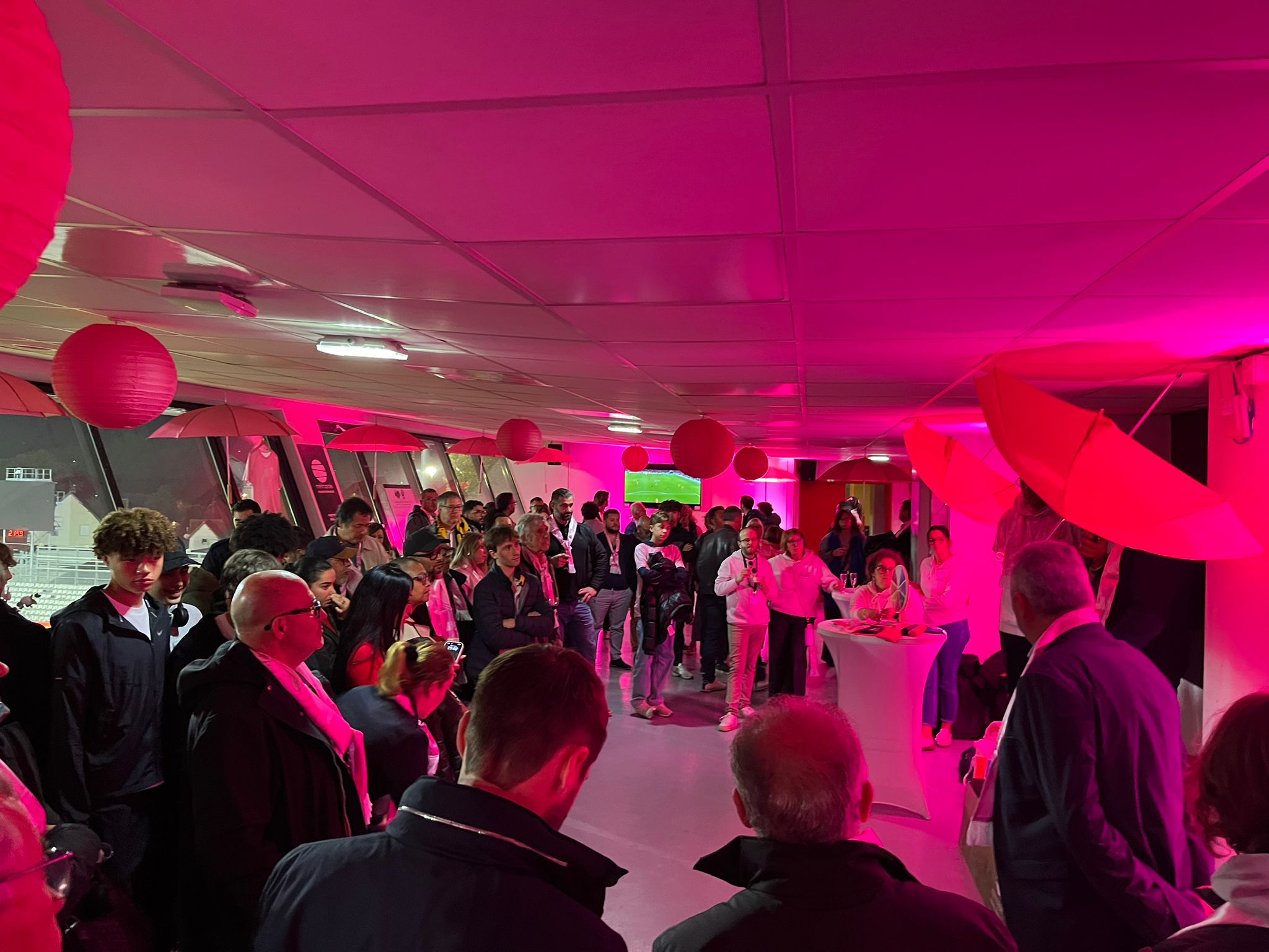 Dès l’entrée, les supporters ont été accueillis dans une ambiance festive et engagée : distribution de plus de 5000 écharpes roses, espaces hospitalités décorés de rose, boutique éphémère, accueil VIP assuré par les hôtesses JG Models, et même une prestation culinaire thématique signée Coudray Traiteur. En tribune, un tifo géant arborait fièrement le maillot rose collector, symbole de la campagne de sensibilisation.